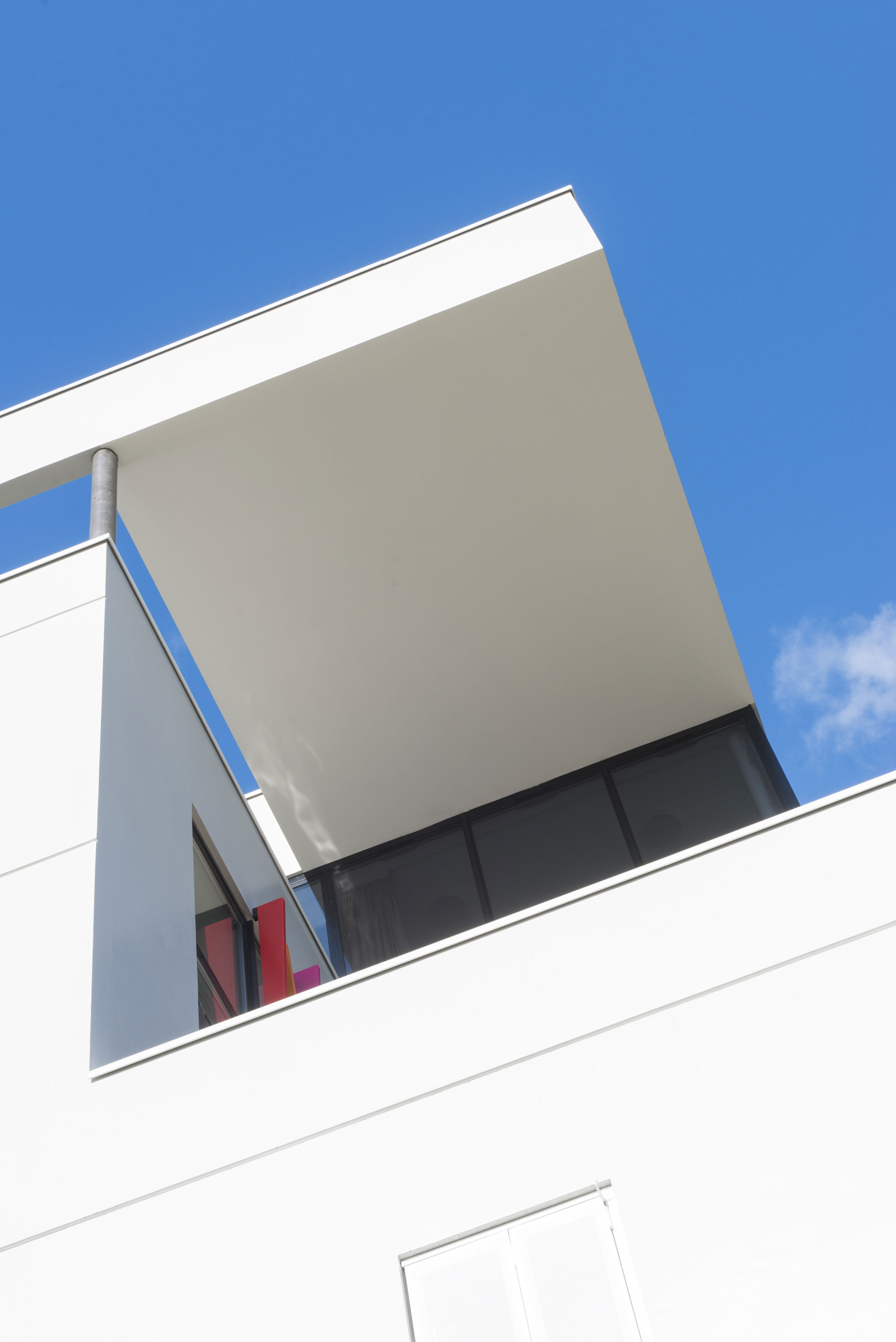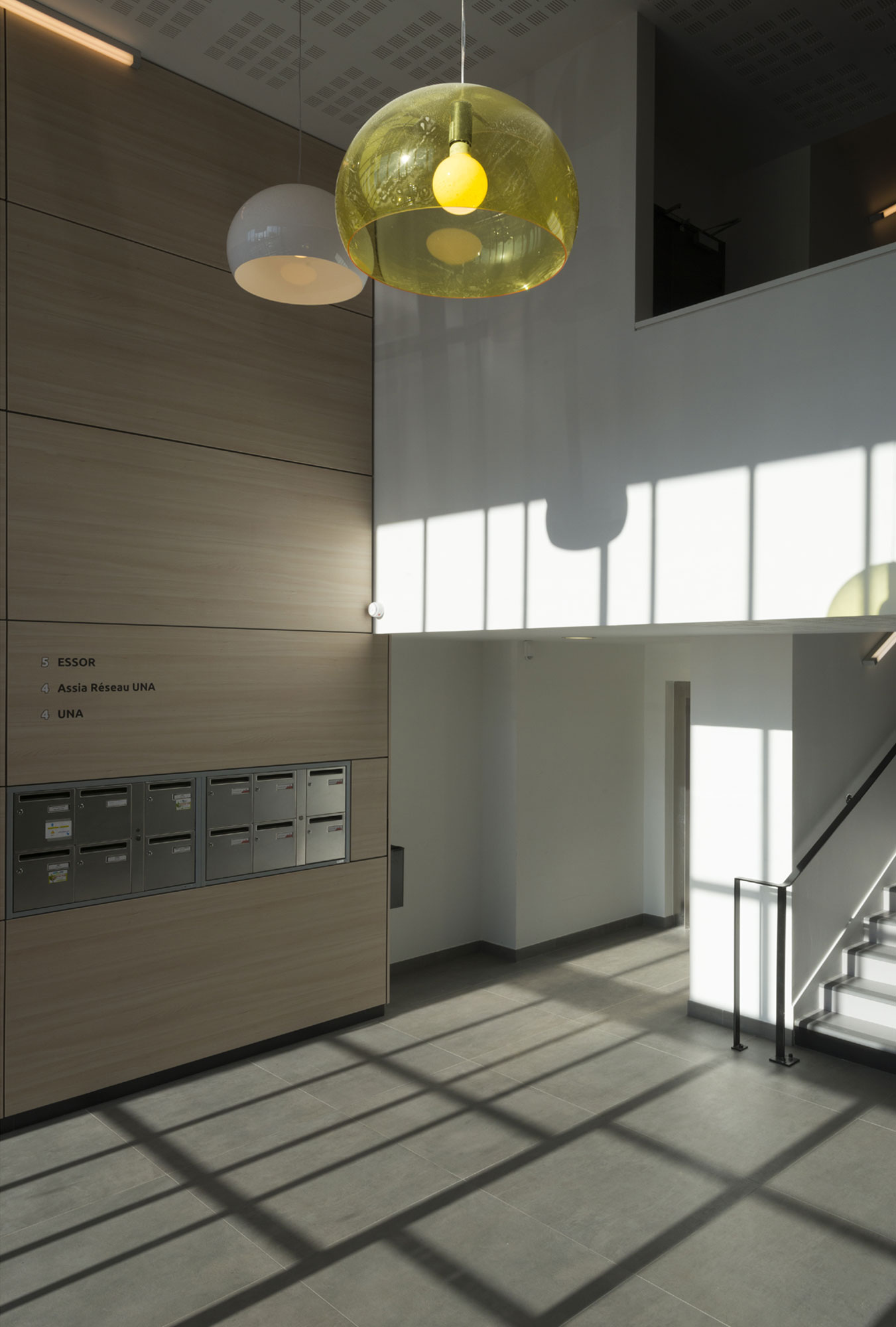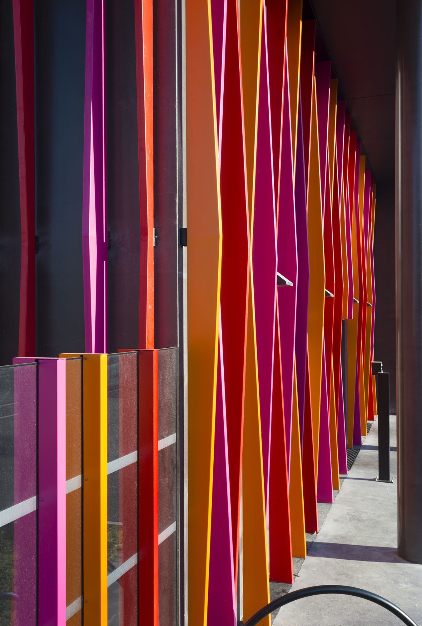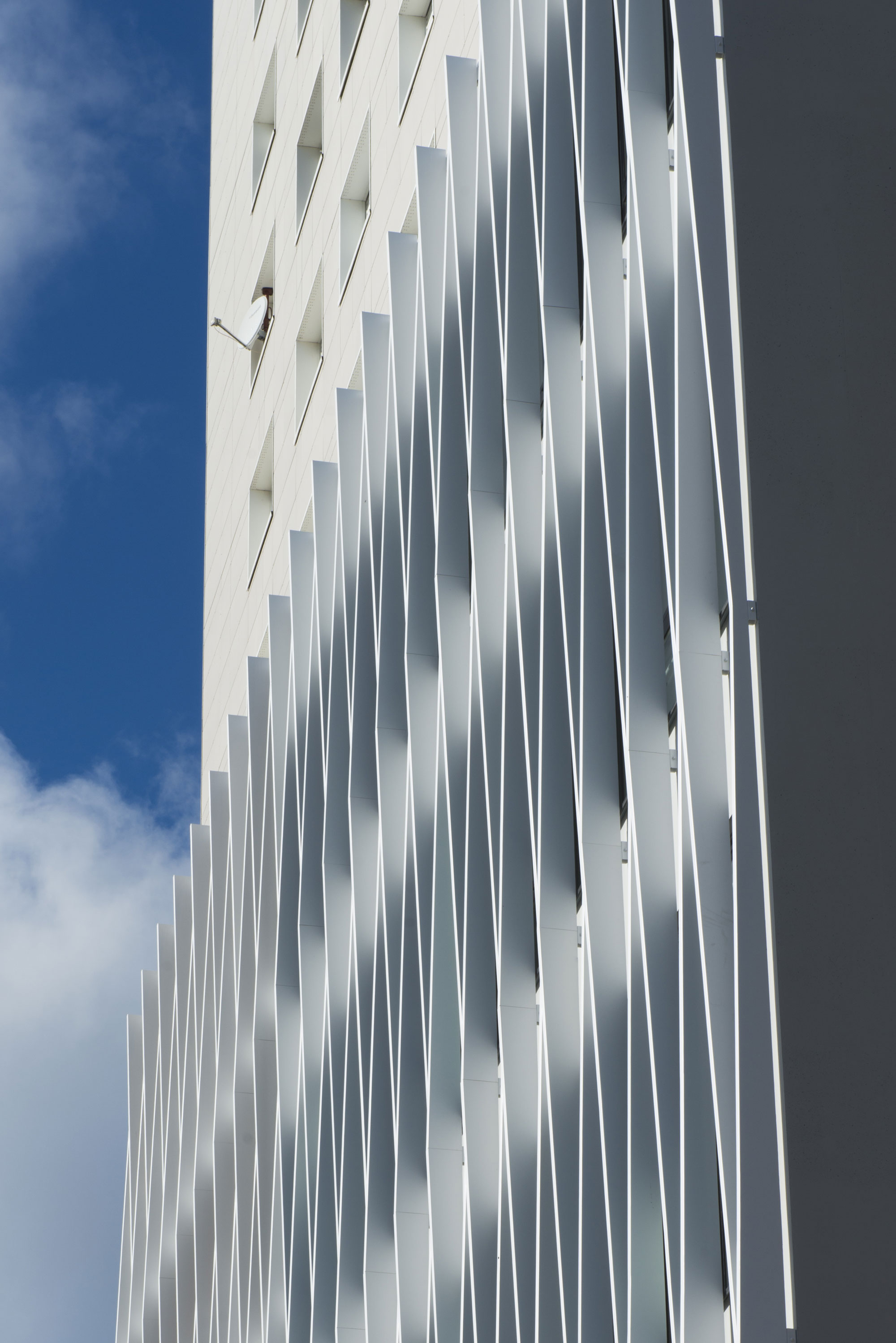 Le volume est simple, lumineux. Le travail des façades a 2 orientations: des vides, des dimensions d’ouvertures différentes retranscrivent l’activité du bâtiment. Les brises soleils, qui deviennent bardage à certains endroits créent du mouvement, dans cet environnement relativement statique.
