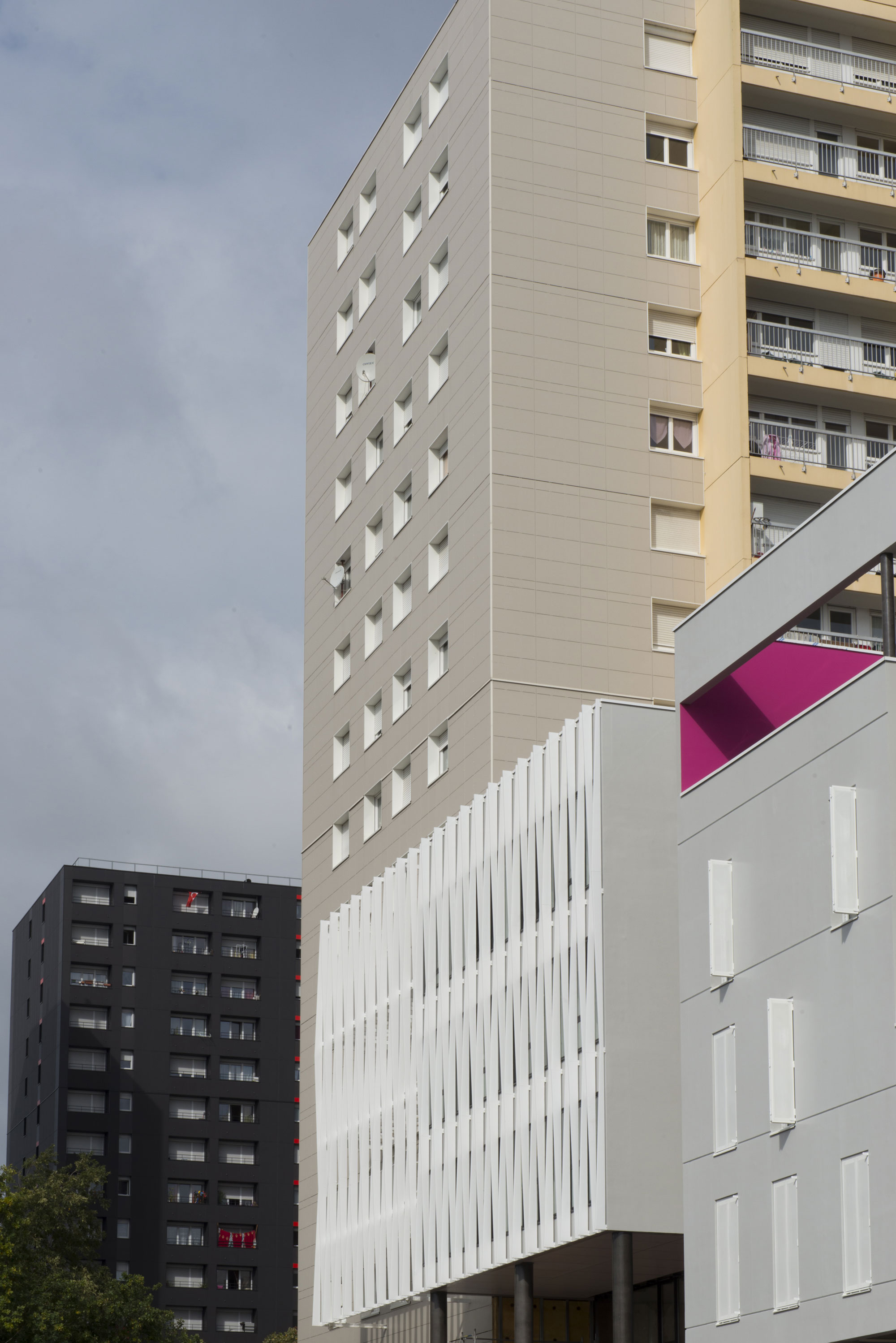 Le projet s’inscrit dans une volonté de changement d’usage, et de renouvellement urbain: requalifier un quartier de logements des années 50. Le projet vient pénétrer dans la tour d’habitation. Sept logements sont transformés en bureaux. Le projet prolonge le rythme du front bâti, génère un entre-deux: un jardin minéral constitue la nouvelle entrée de la tour.