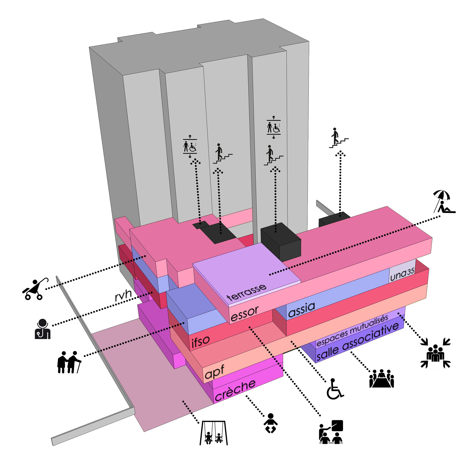 Une crèche de 40 places et 6 associations liées à l’aide à domicile, et aux personnes handicapées se regroupent dans ce projet : un centre de formation pour aide-soignants, une salle associative, un centre maternel associé à 6 logements pour très jeunes mamans, des bureaux.